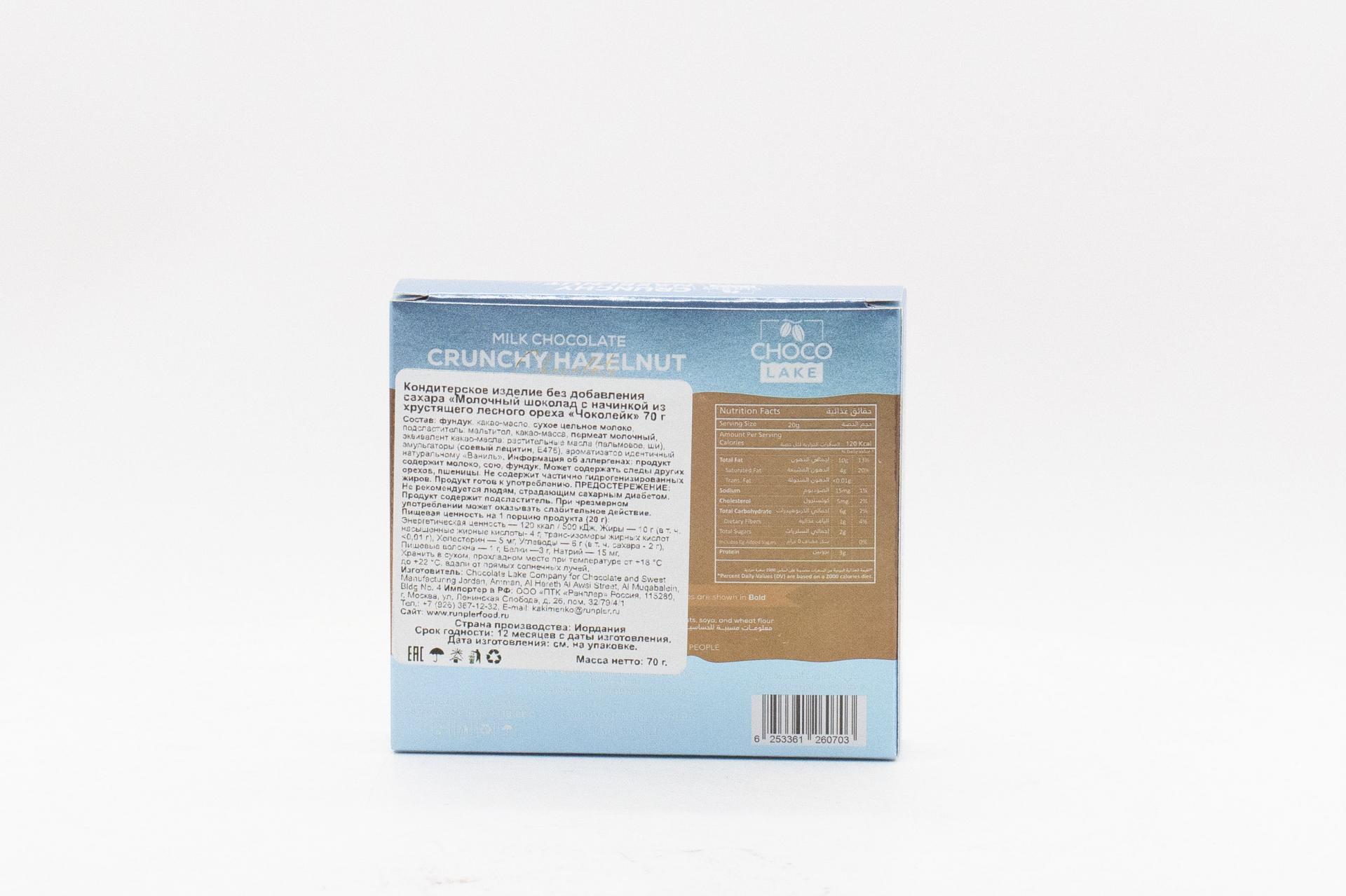 Молочный шоколад без сахара Choco Lake с начинкой из хрустящего лесного ореха (Иордания) 70г281,75 руб. за штуку (в упак. 20 шт.) |